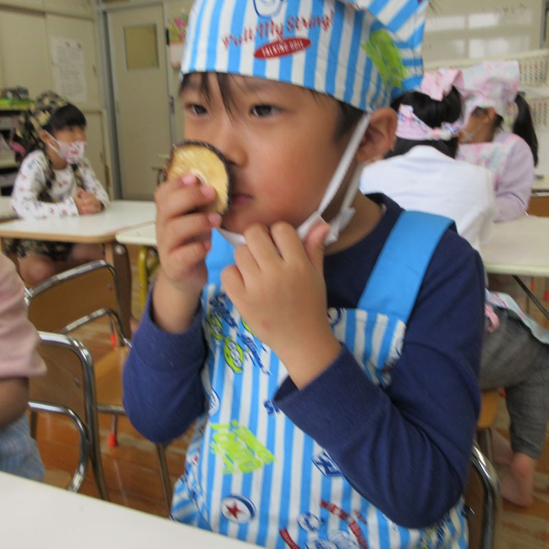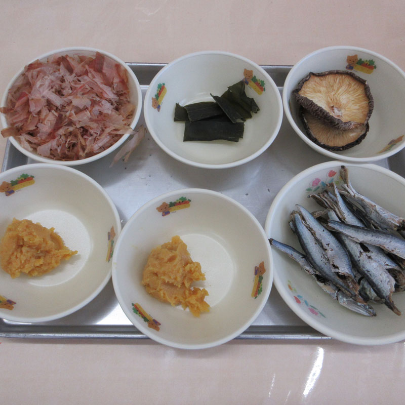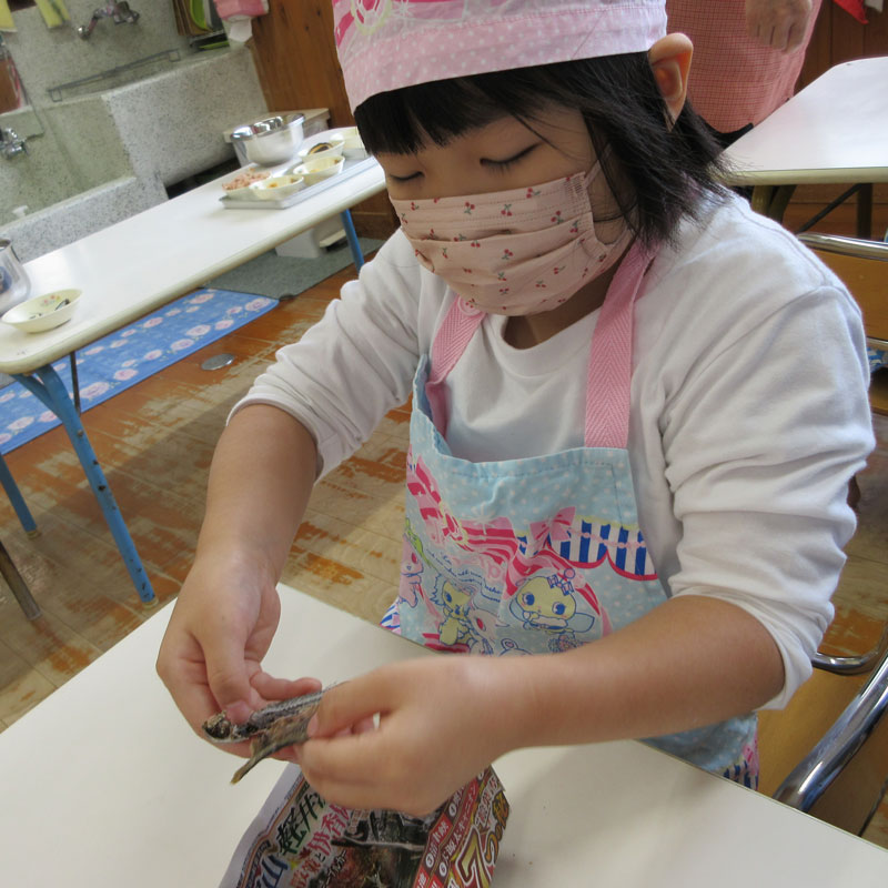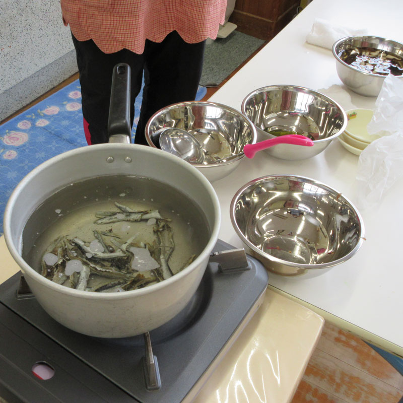 和食やだしの説明をした後、実際のこんぶ、かつお節、干ししいたけに触れてにおいを嗅いでもらい、煮干しは下処理の体験をしました。