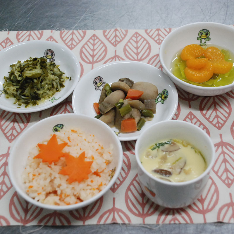 多治見市の保育園では、手作りを基本に季節に合わせた献立作成をしています。紅葉が鮮やかな季節となる11月下旬は、紅葉ご飯や茶碗蒸し、里芋の煮物といった秋らしい和食献立を取り入れており、今回は「和食の日」に合わせて提供しました。