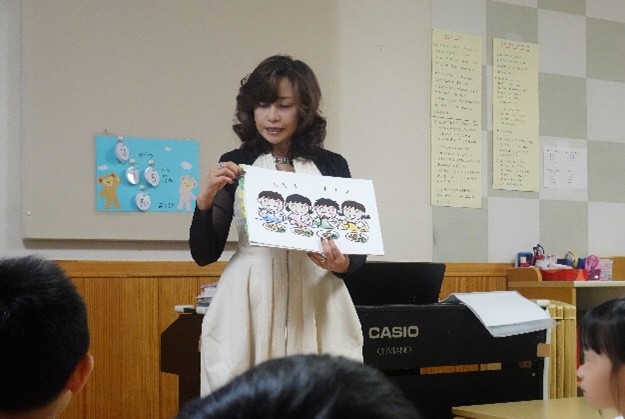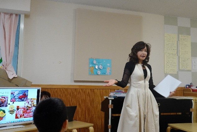 和食ってなぁに? 一汁三菜の配膳、そして食べ方のマナーについて、パワーポイントや紙芝居も交え、わかりやすくお話しをしました。子どもたちは皆、とても楽しそうに熱心に耳を傾け、活発にコミュニケーションをとることもできました。