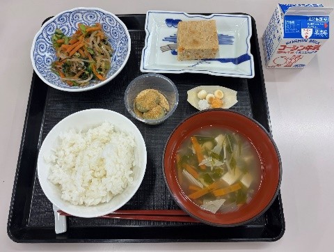給食は、和食器を使った和食献立で、白ごはん、十三夜のかしわ蒸し、小松菜のおひたし、湯葉入りすまし汁、お茶だんご、牛乳と緑茶、金平糖とボーロでした。