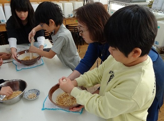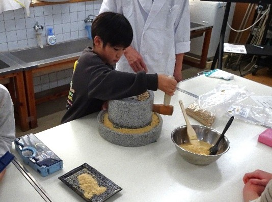 三信化工様の授業は『すがたを変える食べもの』です。大豆・米・お茶など6つの素材を、石臼・すり鉢・ミルなどで、「挽く・擦る」体験学習を行い、児童全員が全ての素材に触れました。和食をテーマにした横断的な総合学習であることを踏まえ、「すがたを変える」=「工夫」=「ごちそう」であるという落し込みをし、粉にすることは誰かのために工夫したおいしい食べ物であると伝えました。