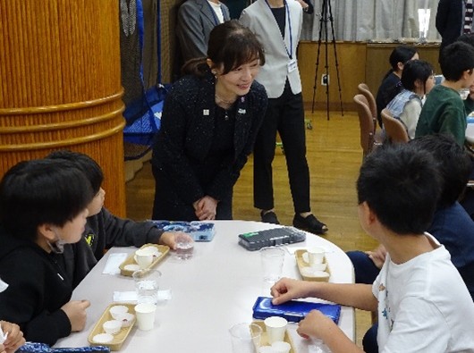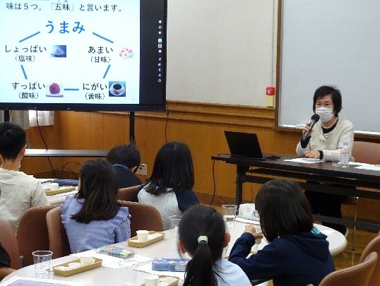 後藤副会長からは「食べることは、たのしい。」をメッセージとし、『和食のおいしい食べ方』、『和食における「だし」「うま味」の大切さ』を学びました。「五味体験」では、子どもたちが塩味・酸味・苦味・甘味・うま味を感じる食材を実際に口に入れながら、食べ物がさまざまな味で構成され、さまざまな味を舌で感じることを実感します。そして和食にとって「だし」は欠かせないものであり、和食は「だしのうま味」を味わう料理であることを知りました。