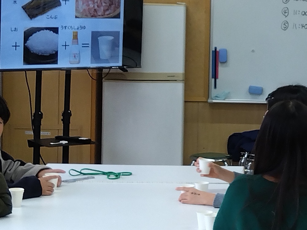 講義の後、鰹と昆布の合わせだしいり味噌汁、だしなし味噌湯、だしの試飲を行いました。