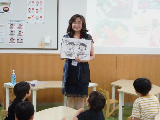 最初に、和食ってなぁに? から始まり、日本ならではの米・野菜・魚など多様な食材について伝えました。そして紙芝居を使い、「和食」には様々な人たちが関わっていること、「いただきます」「ごちそうさま」は、食べ物やそれを作ってくれた人たちへの感謝の気持ちを表すことばであることをお話しました。