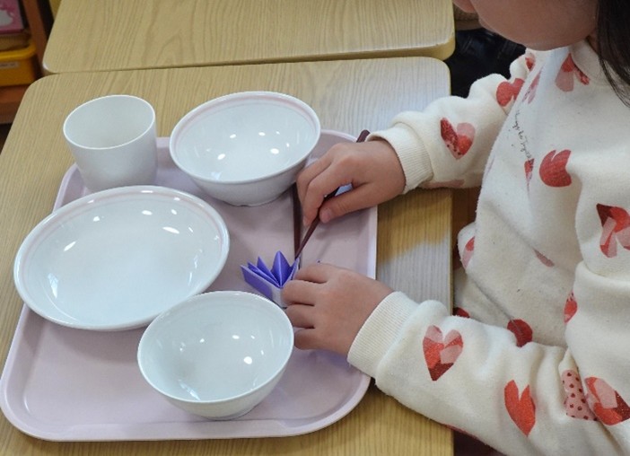 和食の基本形式である一汁三菜の配膳を説明し、折り紙で箸置き作りを一緒に楽しんだ後、園がご用意くださった給食用の食器と箸に、作ったばかりの箸置き加えて、園児自ら配膳を行いました。