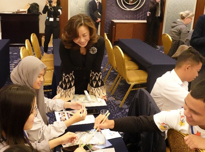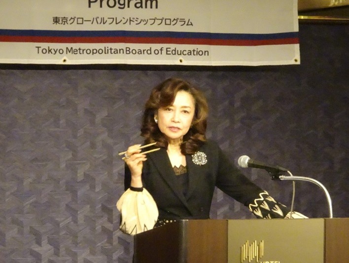 12月7日(日)、東京都教育庁様が実施している「東京グローバルフレンドシッププログラム」において、海外からの高校生の留学生42名(及び引率者9名)を対象に、英語による「和食とマナー」に関する講演会を行いました。場所は池袋ホテルメトロポリタンにて、和食会議会員 食空間コーディネーター資格認定講師・食卓文化研究家 長尾典子氏が講師となり、実施いたしました。