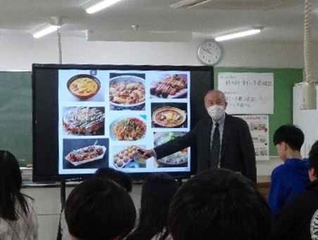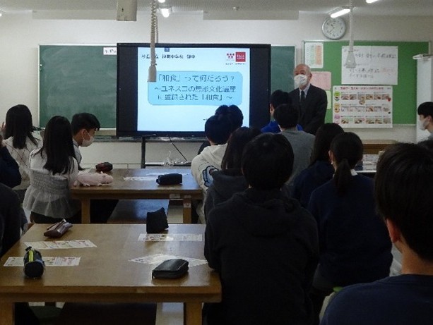 2026年3月12日に杉並区立神明中学校で3年生2クラスを対象に出前授業を行いました。講師は事務局の稲田が、だし引きを事務局の森田と和食文化継承リーダーの秋山敦子さんが担当しました。