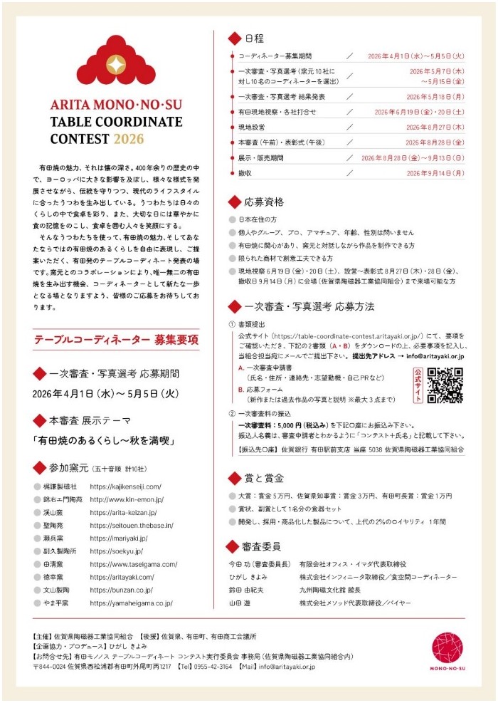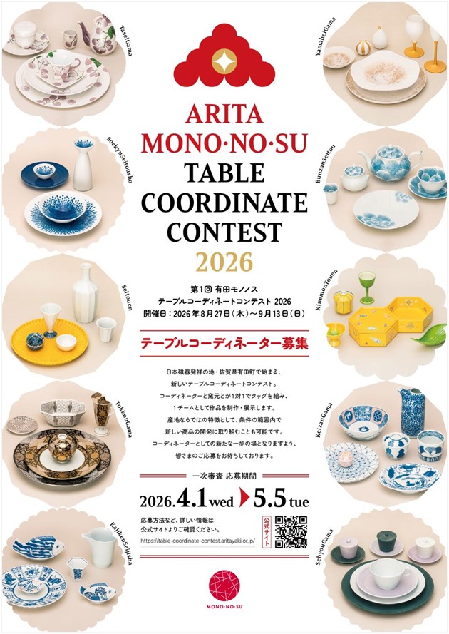 佐賀県陶磁器工業協同組合(所在地:佐賀県有田町)は、「第1回有田MONO・NO・SUテーブルコーディネートコンテスト2026」の開催を決定し、2026年4月1日(水)よりテーブルコーディネーターの募集を開始いたします。和食会議会員・(株)インフィニータ取締役・食空間コーディネーターのひがしきよみ氏が企画協力・プロデュースを担当します。
