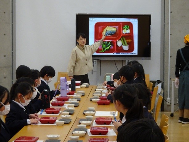 授業は、「一汁三菜」「配膳とマナー」から「和食器」の文様等に関することまで多岐に亘り、ユネスコ無形文化遺産「和食」全体に及ぶ内容でした。また、ワークショップとして、子どもたちが自ら食器の配膳を行う練習をしました。