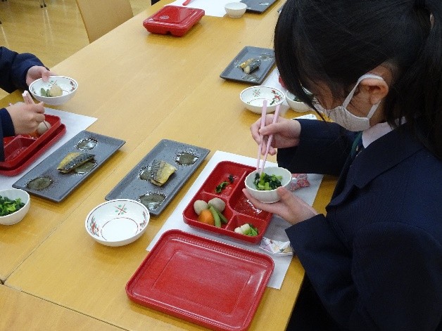 次に、和食器を使って給食を喫食しました。授業を受けたすぐ後に、一人一人が和食器を並べて食材の盛り付けを行うことで、子どもたちは「和食をおいしくきれいにいただく」ことの大切さと意味を実感できた様子でした。そして、いつもの給食をよりおいしく感じられ、完食につながった子どもが増えたようでした。
